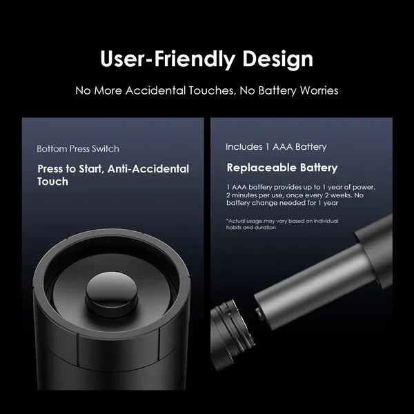 Compact trimmer with detachable dual-blade head and 360° high-speed rotation (10,000 RPM) for safe, comfortable grooming. Includes 1× AAA battery. Blade material: SUS301 stainless steel. Model: ONT-210N.